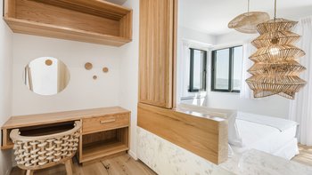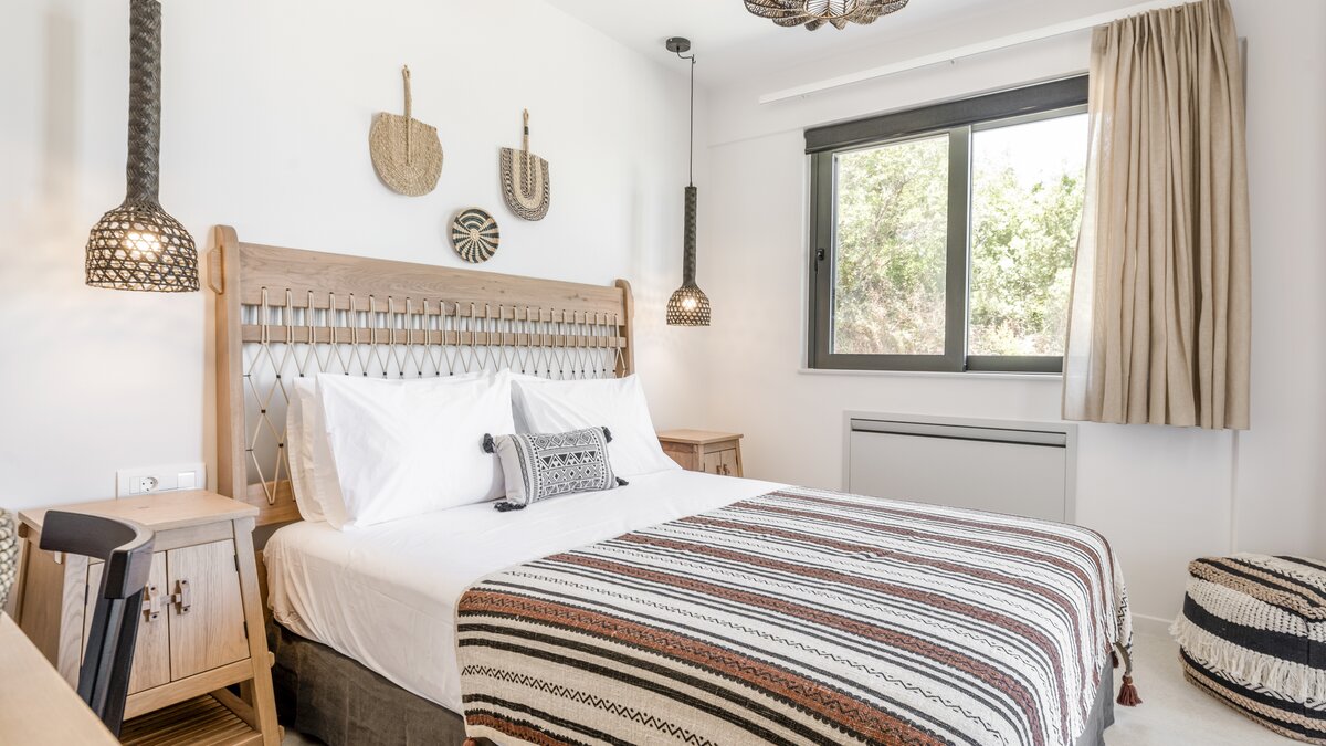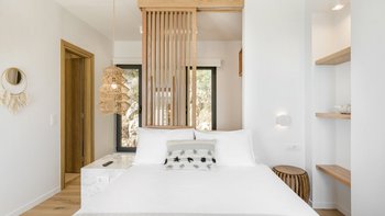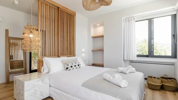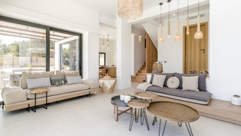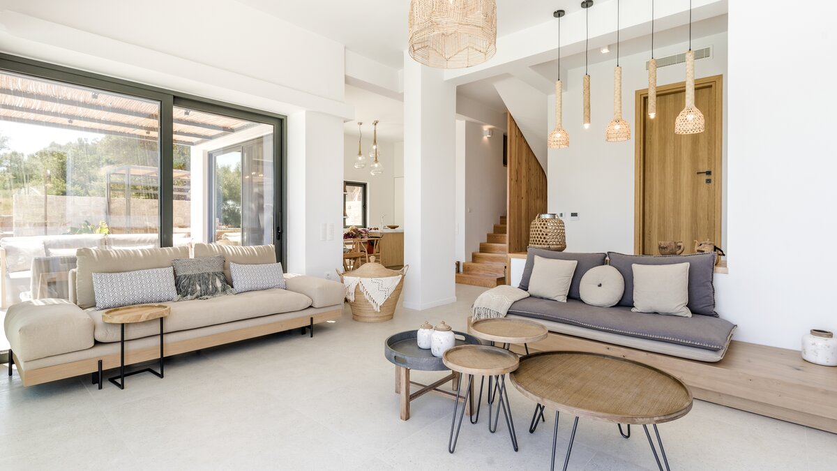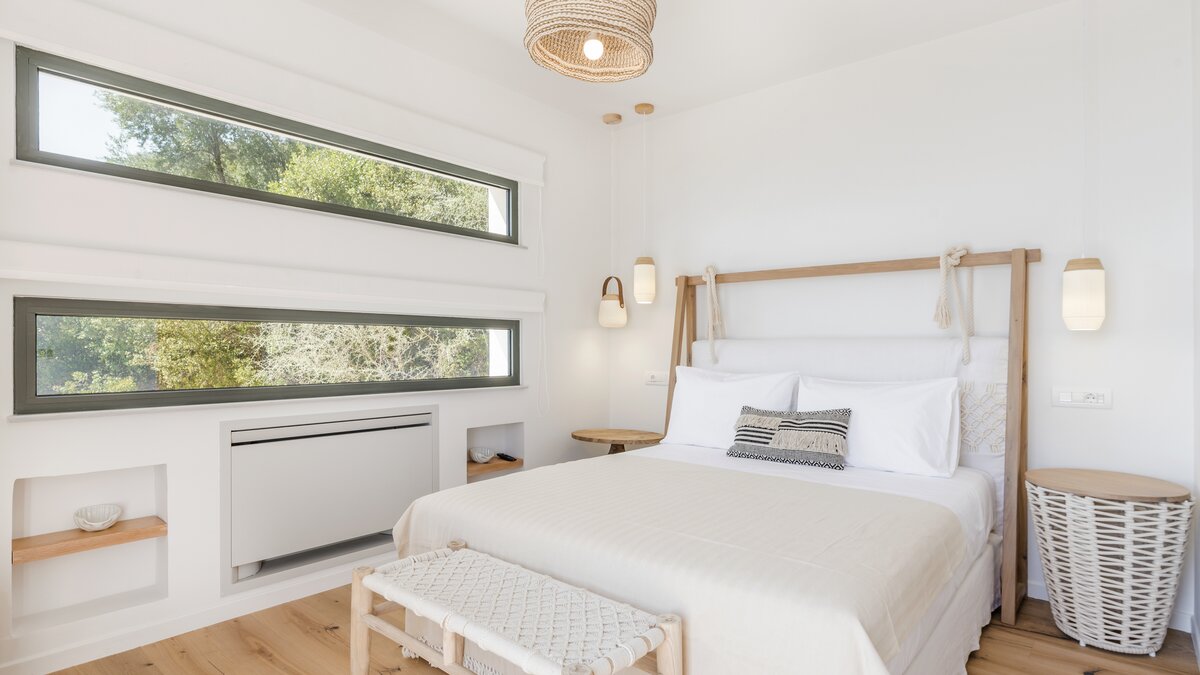 The villa spans three levels, with the ground floor accommodating a bright, open-plan living area, fully equipped kitchen, and a bedroom. Two additional bedrooms are located on the first floor, while the basement offers a small gym and wellness area, complete with a steam bath. Interiors are light, airy, and welcoming, with crisp white walls complemented by natural materials, including wood, bamboo, cane, and woven straw throughout the furniture and decorative elements.