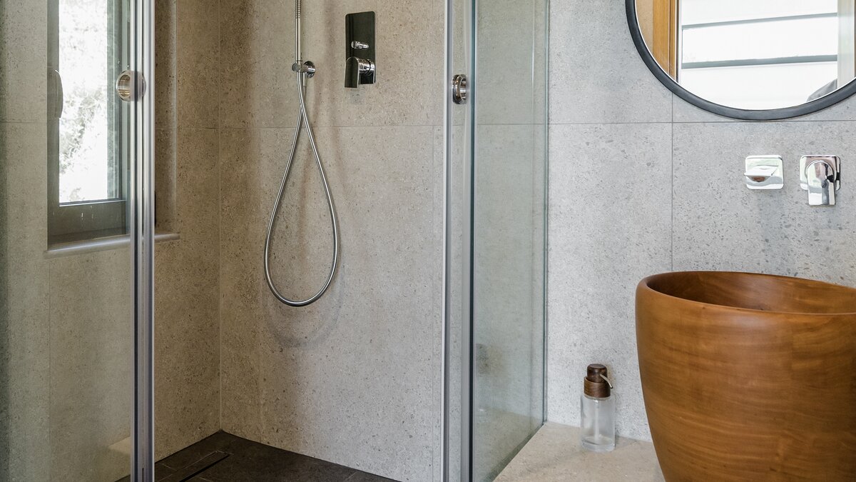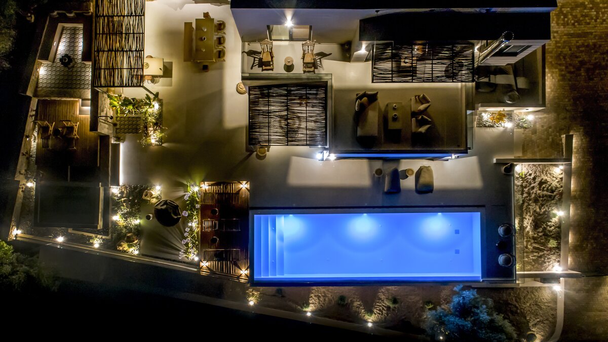 Outdoors, the design flows seamlessly into multiple terraces and lounge areas, following the natural slope of the hill. Landscaped strips and water features add texture and interest, creating a serene and private setting for relaxation or entertaining.