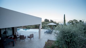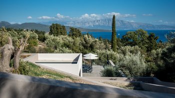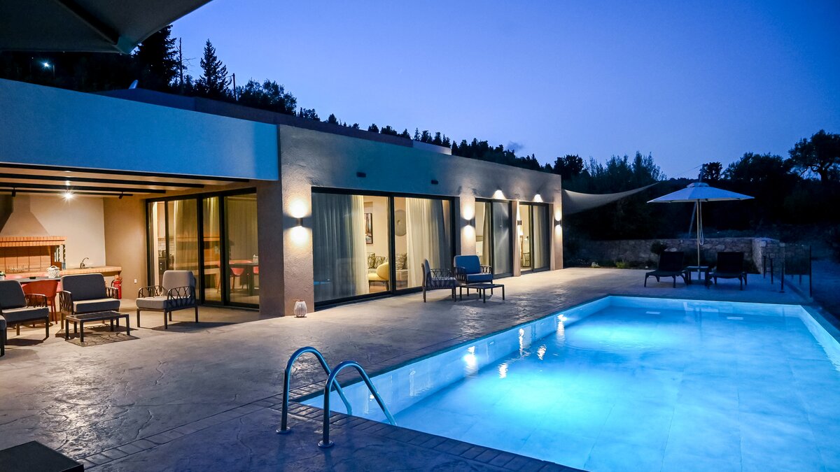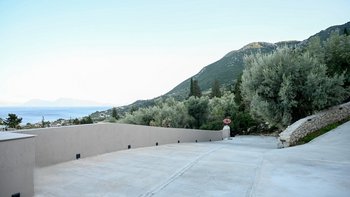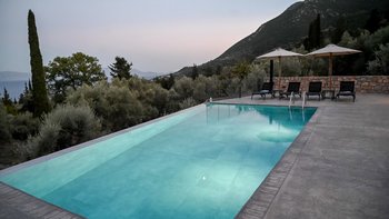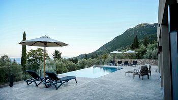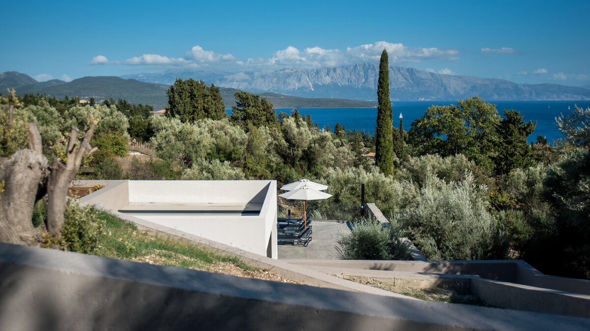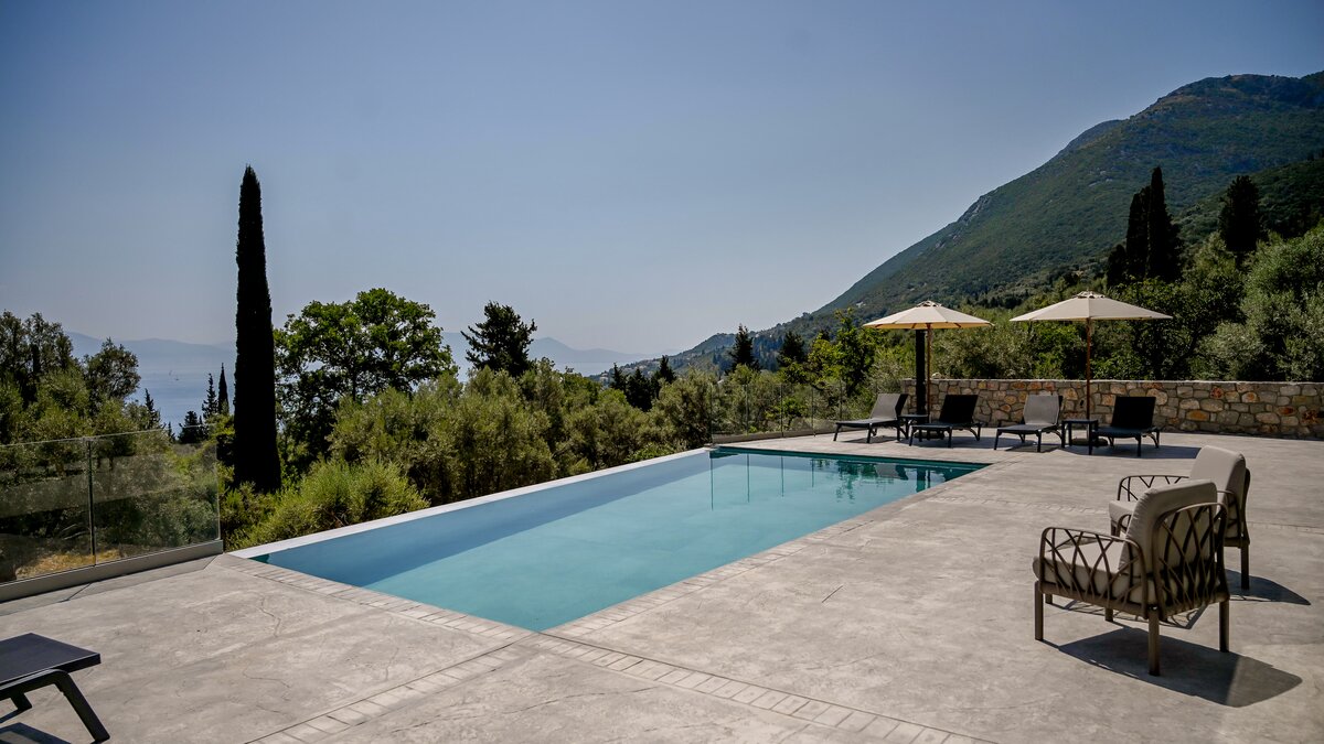 Der Außenbereich ist wirklich das Herzstück der Villa Dahlia. Im Mittelpunkt steht der große Infinity-Pool, umgeben von verschiedenen Entspannungsplätzen mit Liegestühlen und bequemen Sesseln. Ein Essbereich im Freien bietet den perfekten Rahmen für unvergessliche Mahlzeiten mit atemberaubender Aussicht. Von diesem Aussichtspunkt aus können die Gäste die Ostseite der Insel, das weite Ionische Meer, die Akarnanische Küste und die majestätischen Berge von Epirus bewundern. Deren Lage der Villa zwischen Oliven-, Mandel- und Zypressenbäumen, mit aromatischen Kräutern und Blumen, die die Dächer und Blumenbeete schmücken, schafft ein sensorisches Erlebnis, das die Gäste mit der natürlichen Schönheit der Insel verbindet.