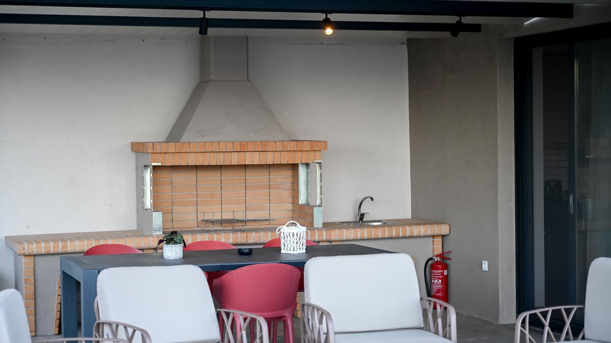 Im Inneren werden die Gäste von einem offenen Raum empfangen, der die Küche, den Ess- und den Wohnbereich nahtlos integriert. Denen sanften Grautöne schaffen eine beruhigende Atmosphäre, während die voll ausgestattete Küche zu kulinarischen Entdeckungen einlädt. Dessen Hauptschlafzimmer mit eigenem Bad verspricht eine erholsame Nachtruhe. Dessen zweite Schlafzimmer mit zwei Einzelbetten sorgt für eine komfortable Unterkunft für alle Gäste. Beiden Zimmer sind durchdacht mit offenen Schränken und Schreibtischen ausgestattet, während das Gemeinschaftsbad mit einer wunderbaren Auswahl an Pflegeprodukten bestückt ist.
