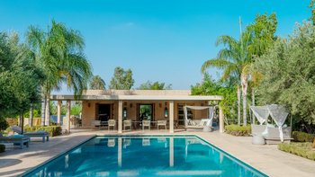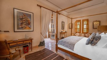 Die große, teilweise überdachte Terrasse, die die beiden Hälften des ersten Stocks verbindet, verfügt über einen Kamin und ist ideal für einen Sundowner mit Panoramablick auf den Sonnenuntergang über dem Atlasgebirge. Im Gästehaus gibt es ein weiteres Doppel- und Zweibettschlafzimmer, die etwas kleiner sind und zu einer Gemeinschaftsterrasse führen. Wenn man von der Terrasse in die weitläufigen Gärten spaziert, findet man den großen Privater Pool und die Terrasse mit bequemen Liegen und Sofas, das Poolhaus mit Küchenzeile, Hamam, Fitnessraum sowie einen Sandtennisplatz, Krocket- und Bouleplatz. Eine ultra-entspannende Atmosphäre wird durch Frühstück, Housekeeping-Service und Concierge-Service verstärkt, und die Köche bereiten das Mittag- und Abendessen zu. Mit einem sehr hohen Maß an Komfort und Service und einem guten Preis-Leistungs-Verhältnis ist dies eine sehr gute Option für Freunde oder Familien, die zusammen reisen.
