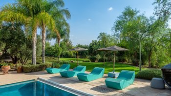 Wunderschöne, voll ausgestattete Villa mit großem Pool, Tennisplatz, Hamam und Yoga-Raum inmitten von Rasengärten. Angrenzend an den Golfplatz Assoufid und in der Nähe des lebhaften Marrakesch.