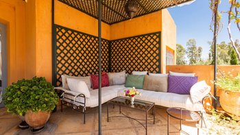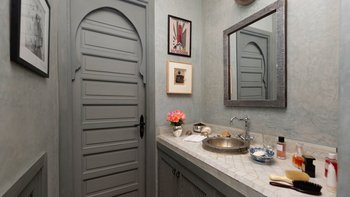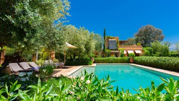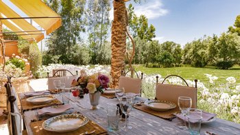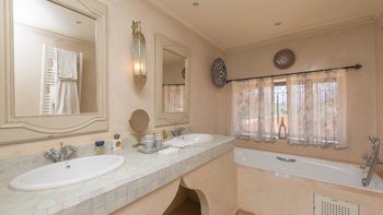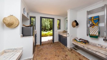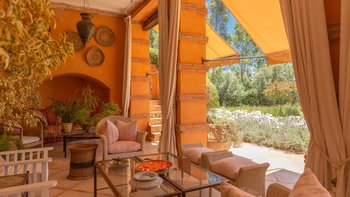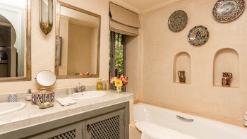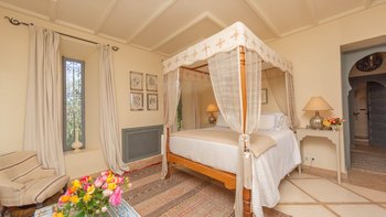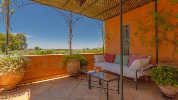 Jedes der beiden Schlafzimmer im Erdgeschoss öffnet sich auch zu einer eigenen Terrasse. Das Hauptschlafzimmer im ersten Stock öffnet sich zur komfortablen Dachterrasse und bildet ein Wohnzimmer im Freien mit Sofas und Tisch, das einen herrlichen Blick auf das Atlasgebirge bietet. Auf dem Grundstück befindet sich ein Swimmingpool, ein Pool-Umkleidehaus, das von einer Pergola am Pool überblickt wird; und ein Tennisplatz (gemeinsam mit anderen Häusern auf diesem Privatgrundstück) und ein Fitnessraum sorgen für aktive Aktivitäten. Und das ganze Ensemble wird von engagierten Mitarbeitern bedient, zu denen ein Hausmanager, ein Koch und eine Haushälterin gehören, die die Möglichkeit bieten, lokale und europäische Gerichte zu probieren.