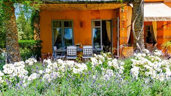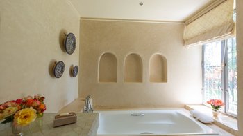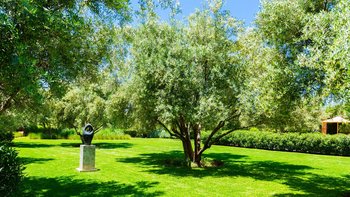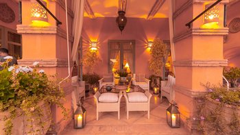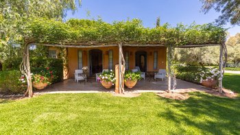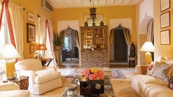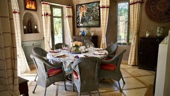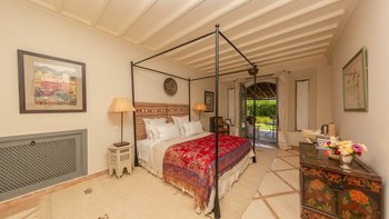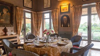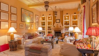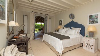 Eine üppig angelegte Gartenanlage umgibt dieses äußerst elegante Haus und bietet einen sehr hohen Standard an Komfort und exzellenten Service. Innerhalb des Hauses befinden sich hoch ausgestattete Zimmer, die mit edlen Stoffen ausgestattet sind und durch wunderschöne Drucke und Gemälde ergänzt werden. Ein anmutiger Speisesaal öffnet sich zu einem schattigen Essbereich im Freien. Der Speisesaal ist offen zum äußerst eleganten Wohnzimmer, das sich wiederum zur Gartenterrasse öffnet, die wunderschön mit weichen Sitzgelegenheiten ausgestattet ist und sich perfekt für einen Drink vor dem Abendessen eignet.