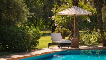 Innerhalb des Haupthauses gibt es eine große Eingangshalle, die zum Speisesaal führt, der Platz für bis zu 14 Gäste bietet. Der Salon verfügt über ein Holzfeuer, das an Wintertagen und -abenden bei Bedarf angezündet wird. Der Salon verfügt über ägyptische Wandbehänge aus den 1930er Jahren und antike Textilien, die von der Familie gesammelt wurden, fügen sich wunderbar mit eingelegten syrischen Spiegeln und Möbeln aus Perlmutt zusammen. Französische Türen führen auf die Terrasse mit einem Sitzbereich und einer mit Bougainvillea überdachten Pergola, die einem der Esstische Schatten spendet.