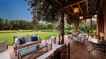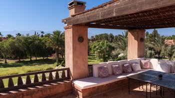 Es gibt eine Treppe zur Dachterrasse mit spektakulärem Blick auf das Atlasgebirge und einen gepolsterten Sitzbereich unter einer Pergola für bis zu 16 Personen. Hier werden normalerweise Aperitifs serviert und sind ideal für eine Yoga-Praxis.