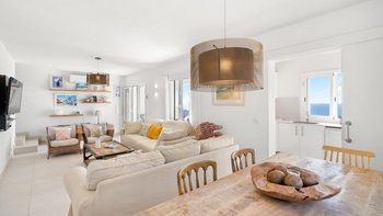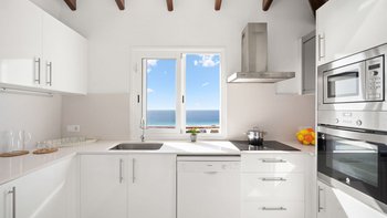 Im Inneren finden die Gäste einen geräumigen, lichtdurchfluteten Wohnbereich mit einer klaren, modernen Ästhetik. Der OFFENER GRUNDRISS verbindet sich nahtlos mit einer voll ausgestatteten Küche und schafft so einen praktischen und einladenden Raum für das tägliche Leben. Große Fenster rahmen den malerischen Meerblick ein und bringen die natürliche Schönheit Menorcas in das Herz des Hauses. Dieser Wohn- und Essbereich bietet einen komfortablen Rahmen, um sich zu entspannen und Zeit mit der Familie oder Freunden zu verbringen.