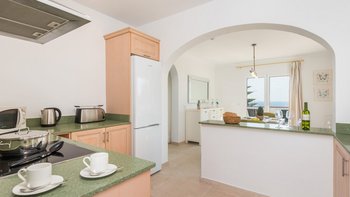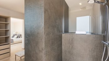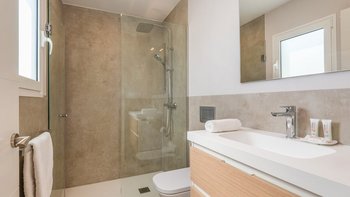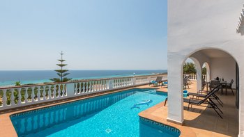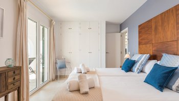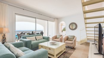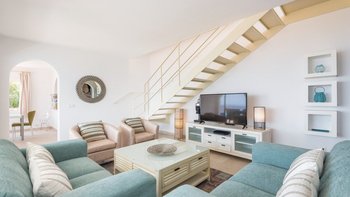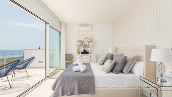 Der offene Wohn-, Ess- und Küchenbereich öffnet sich zum Äußeren der Villa. Drei Zweibett-Schlafzimmer, zwei mit eigenem Duschbad und eines mit Zugang zur Poolterrasse, ein Duschbad und ein Hauswirtschaftsraum vervollständigen das Erdgeschoss. Deren obere Ebene der Villa del Mar ist ausschließlich für das herrliche Hauptschlafzimmer, ein eigenes Duschbad und eine Panoramaterrasse mit atemberaubender Aussicht vorgesehen. Deren Innenräume sind elegant und stilvoll, mit frischen Weißtönen und Pastelltönen, mit modernen Möbeln und hochmodernen Einrichtungen.