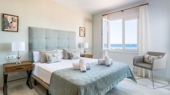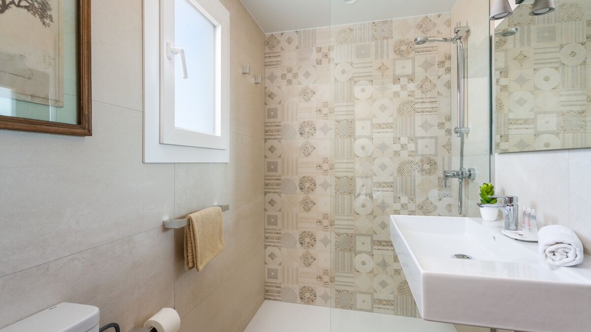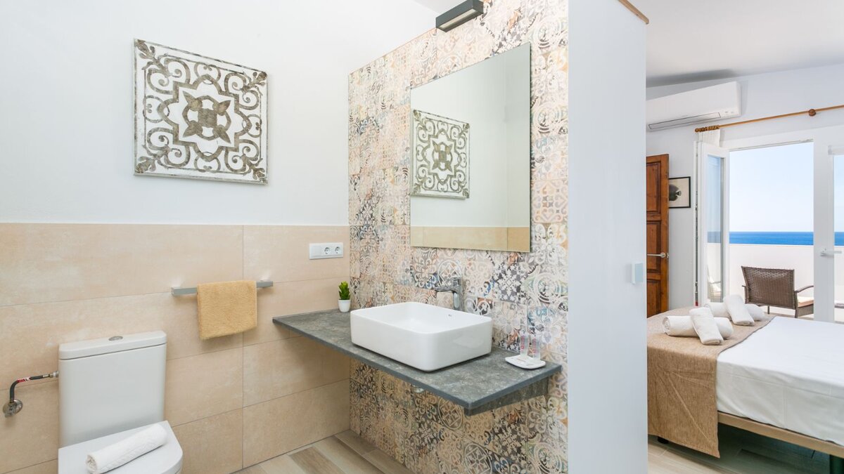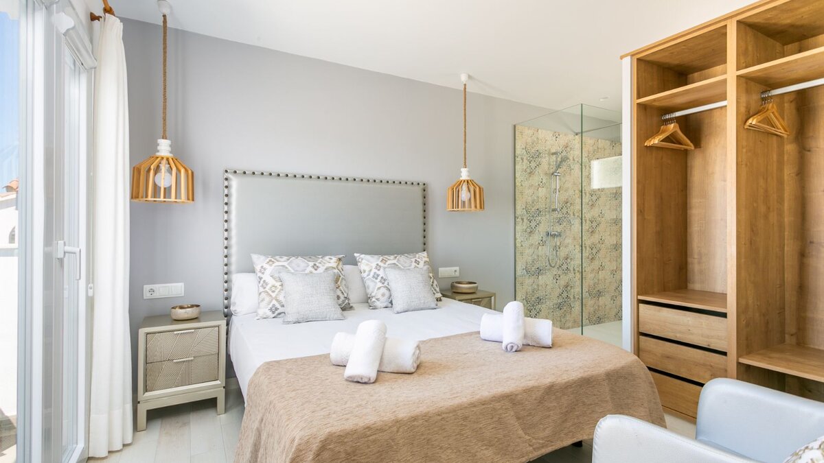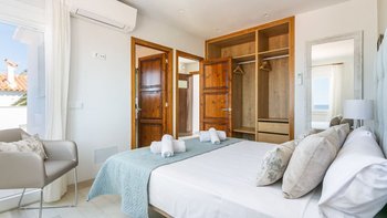 Auf der Eingangsebene befinden sich zwei ruhige Doppelschlafzimmer, jedes mit einem offenen Bad mit Dusche und großzügigem Stauraum im Kleiderschrank. Beiden Zimmer öffnen sich auf eine Gemeinschaftsterrasse mit atemberaubendem Meerblick – perfekt für ruhige Morgenstunden oder Momente bei Sonnenuntergang.