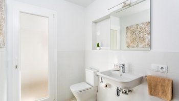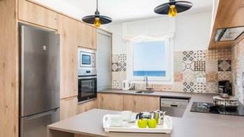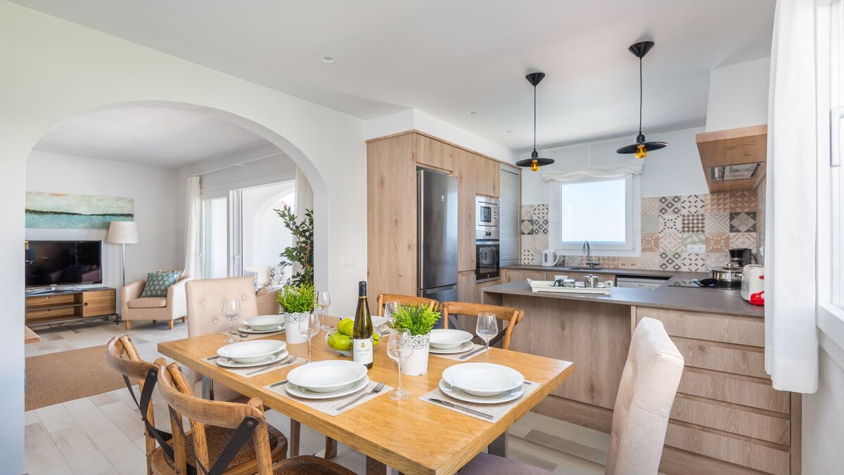 In der UNTERE ETAGE befindet sich das dritte Schlafzimmer mit zwei Einzelbetten und eigenem Bad neben einem geräumigen und lichtdurchfluteten Wohnbereich. Große Glasschiebetüren führen auf eine überdachte Terrasse mit einem Essbereich im Freien und einem einladenden Chill-out-Bereich mit Blick auf die Küste von Son Bou. Der Wohnbereich verfügt zudem über einen Smart-TV mit Internetzugang und eine IPTV-Box mit einer Auswahl an internationalen Kanälen. Deren moderne, offene Küche ist komplett ausgestattet und wird durch eine praktische Essecke ergänzt.