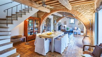 Für einen wirklich erholsamen Aufenthalt auf dem Land wäre eine geräumigere, elegante und gepflegte Villa schwer zu finden. Casale del Sole ist ein Ort für alle Jahreszeiten und verfügt über weitläufige Gärten, Terrassen im Freien und einen Pool, in dem man wirklich schwimmen kann. Für die kühleren Monate gibt es bequeme Sofas und einen großen offenen Kamin im Wohnzimmer; und Tischtennis und Tischfußball im Spielzimmer. Dessen altes Steinhaus, ein eher erwachsenes Refugium, wurde mit Flair und Stil restauriert und unter den Holzbalkendecken eine sehr moderne Inneneinrichtung geschaffen.