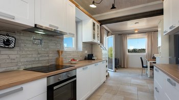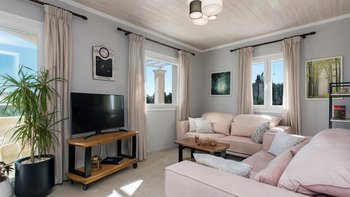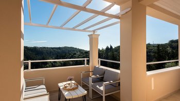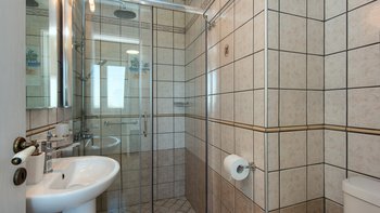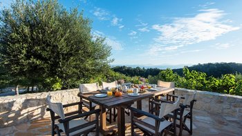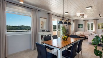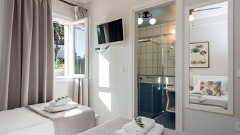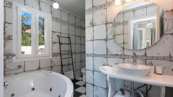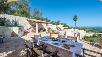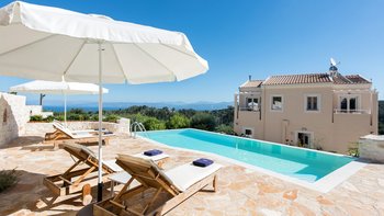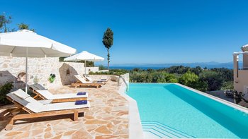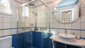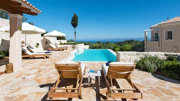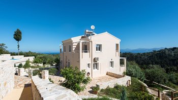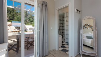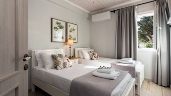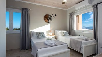 Das Erdgeschoss besteht aus einem offenen Grundriss Wohnzimmer, einer Küche und einem Esszimmer, das auf eine große Veranda führt. Ein Zweibett-Schlafzimmer mit eigenem Bad mit Dusche und Waschküche befindet sich ebenfalls auf dieser Etage. Wenn Sie nach oben gehen, werden Sie mit dem Hauptschlafzimmer begrüßt, einem modernen Zimmer mit zwei Fenstern, die die sanften Hügel von Paxos zeigen. Dieses Zimmer verfügt über ein eigenes Bad mit Jacuzzi-Badewanne und einem privaten Balkon mit Meerblick. Daneben gibt es ein zweites Zweibett-Schlafzimmer mit eigenem Duschbad und einem Balkon.