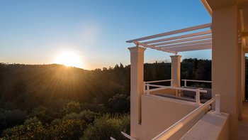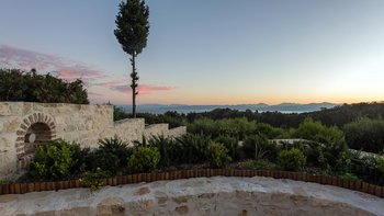 Während Sie die private Auffahrt hinaufsteigen, werden Sie von Rising Sun in all ihrer Pracht begrüßt. Um den Umfang herum schlängelt sich eine wunderschön gebaute griechische Steinmauer, die dafür sorgt, dass Sie sich abgeschieden fühlen, wenn Sie auf dem Gelände herumlaufen.