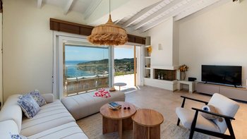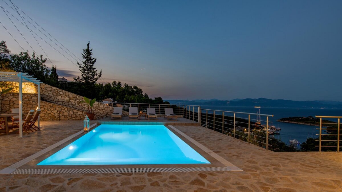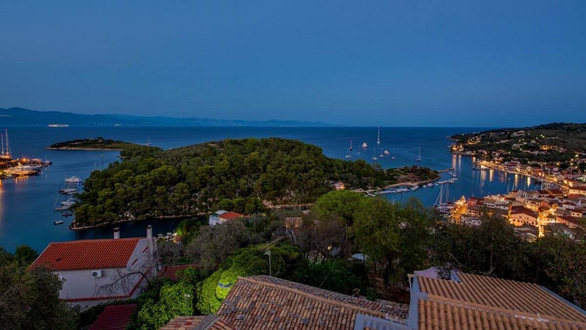 Eine charmante Villa mit zwei Schlafzimmern in Paxos, Griechenland, bietet die Villa Alexa einen weitreichenden Panoramablick von einer einzigartigen Hanglage aus, mit Blick auf die nahe gelegene Hafenstadt Gaios und die Gewässer dahinter.