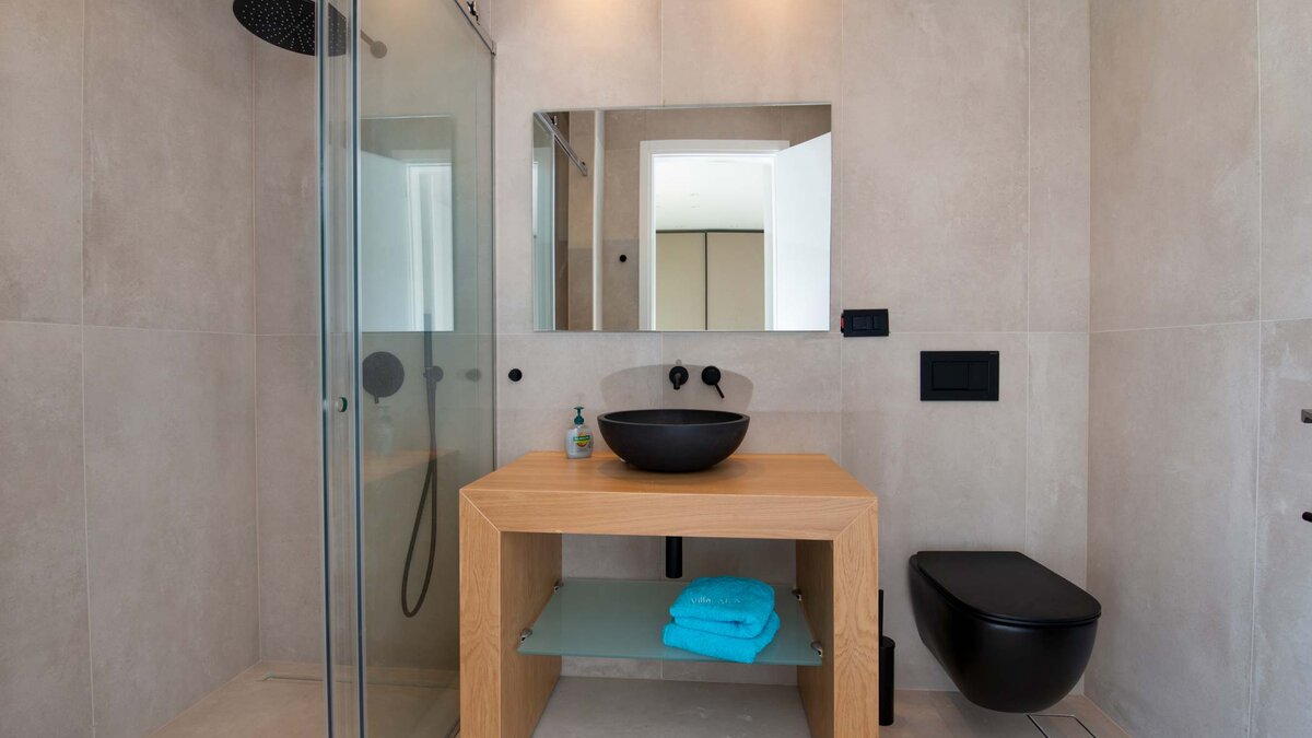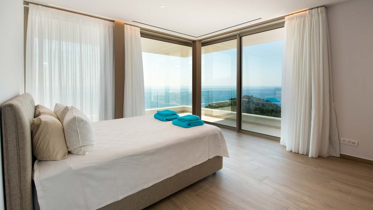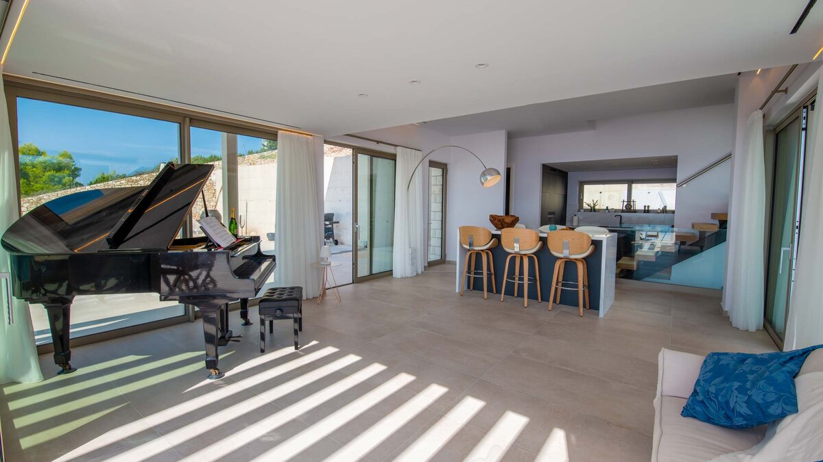 Im Innenbereich ist die Villa so gestaltet, dass sie Kreativität und Komfort inspiriert. Im offenen Wohnzimmer lädt ein Yamaha-Flügel zu spontanen musikalischen Momenten ein, ergänzt durch einen weitreichenden Meerblick durch die raumhohen Fenster. Deren gut ausgestattete Küche, die direkt an diesen Raum angeschlossen ist, ist ein Traum für kulinarische Enthusiasten. Im Obergeschoss befinden sich drei Schlafzimmer mit eigenem Bad, die jeweils mit einem Kingsize-Bett und großzügigem Stauraum ausgestattet sind, und ein viertes Schlafzimmer im Erdgeschoss bietet zusätzliche Privatsphäre und Flexibilität. Dessen durchdachte Aufteilung der Villa sorgt dafür, dass jeder Gast seinen eigenen Raum zum Entspannen findet.
