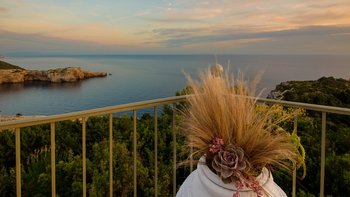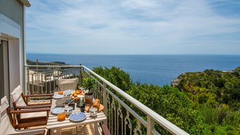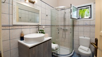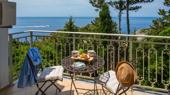 Das moderne Interieur der Villa bietet den Gästen eine warme und einladende Atmosphäre. Der offene Wohnbereich verfügt über ein komfortables Wohnzimmer mit einem großen Fernseher und Balkontüren, die einen atemberaubenden Blick auf das Meer rahmen. Der Essbereich schließt sich nahtlos an den Wohnbereich an und ist ideal für intime Zusammenkünfte. Drei gut ausgestattete Schlafzimmer sind für Familien und Paare gleichermaßen geeignet, wobei das Haupt- und das Doppelschlafzimmer einen bezaubernden Meerblick bieten, während das Zweibettschlafzimmer den üppigen Garten überblickt. Zwei Gemeinschaftsduschen vervollständigen das Interieur der Villa.