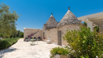 Das Valle d’Itria ist eine stimmungsvolle Gegend, die für ihre kegelförmigen Trulli-Wohnungen bekannt ist und die ideale Lage für ein Festmahl an charmanten Städten und eine Auswahl an herrlichen Stränden bietet. Obstgärten und Weinberge tanken die Sonne in ihrer fruchtbaren und fotogenen Landschaft und bilden den Rahmen für diese bezaubernde Familienvilla in Apulien. Ihre zwei hohen Kegel und die weiß getünchten Mauern, die einen Meter dick sind, sorgen für eine erfrischende Kühle und einen bemerkenswerten Charakter. Denen Villa ist wie der Stolz des lokalen Eigentümers im Landhausstil eingerichtet und verfügt über eine Küche, ein Wohnzimmer und einen kleinen Sitzbereich, wo farbenfroh gepolsterte Sitzgelegenheiten in einen architektonischen Bogen eingebaut sind. Die drei Schlafzimmer sind mit fröhlicher Einfachheit eingerichtet, und es gibt zwei Duschräume und zwei überdachte Essterrassen, von denen eine jetzt über eine beeindruckende, voll ausgestattete Außenküche mit Insel verfügt. All dies befindet sich in einem weitläufigen Garten mit Rasenflächen, Kakteenbeeten und Blumenbeeten, die den Pool und einen angrenzenden Speisepavillon zwischen den Olivenbäumen umgeben. Giu al Trullos ruhige Lage ist nur 3 km vom Supermarkt und ausgezeichneten Restaurants in der ummauerten Marktstadt Cisternino entfernt; und die „weiße Stadt“ Ostuni, der Strand von Torre Cane und ein Golfplatz sind alle innerhalb von 20 km. Sehr privat, aber in unmittelbarer Nähe von Geschäften und ausgezeichneten Restaurants und mit zwei geräumigen Schlafzimmern ist dieses charmante Anwesen ein absoluter Favorit bei CV-Gästen.