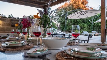 Mit viel Holz und frischen Leinenmöbeln, sind die ruhigen, übersichtlichen Zimmer in einem Kreuzplan angeordnet, mit dem Esstisch in der Mitte, einer Bibliothek mit Wohnzimmer und einem Fernsehraum auf der anderen Seite und einer gut ausgestatteten Küche. Es gibt drei rustikal-chic Schlafzimmer, jedes mit eigenem Duschbad, von denen eines zwei Einzelbetten hat. Draußen gibt es eine herrliche Essterrasse mit Polstersessel Sitzgelegenheiten und ein mit Agapanthus gesäumter Pfad und führt zum Gästeanbau. Von der oberen Dachterrasse aus hat man eine herrliche Aussicht.
