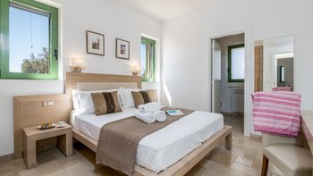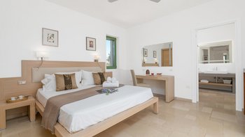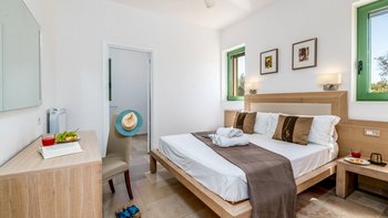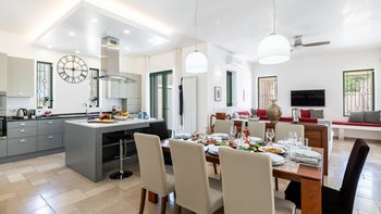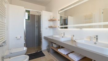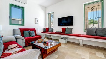 Das Haus verfügt über eine Außenküche mit Grill und Pizzaofen, einen großen überdachten Pavillon für Mahlzeiten im Freien. Der 11m x 5m Pool ist 1m bis 1,4m tief, es hat einen „Strand“-Bereich, in dem man im flachen Wasser liegen kann, während man die Sonne genießt, und wird von einem weiteren Pavillon überblickt, um Schatten zu spenden. Im Inneren gibt es einen hellen und luftigen Wohnbereich mit offenem Grundriss Küche, Ess- und Wohnbereich mit Sofas und Smart-TV und WLAN. Drei Arten französischer Türen führen zum Pool und zum Essbereich im Freien. Im Erdgeschoss befinden sich drei Doppelschlafzimmer (eines kann bei Bedarf als Zweibett genutzt werden), alle mit geräumigen Bädern mit Dusche und Einbauschränken. Es gibt auch eine Gästetoilette und das Haus ist voll klimatisiert. Im ersten Stock befindet sich eine großzügige Master-Suite, die über ein eigenes Duschbad mit Doppelwaschbecken und einer großen ebenerdigen Dusche verfügt. Dieser Schlafzimmer hat Zugang zu einer großen privaten Balkonterrasse und es gibt auch eine nach Westen ausgerichtete Gemeinschaftsterrasse mit freiem Blick auf die Olivenhaine.