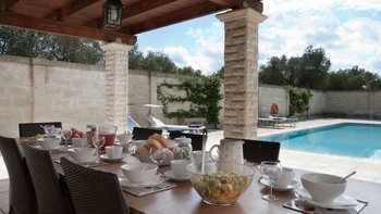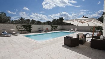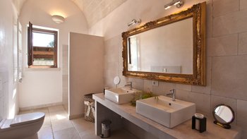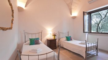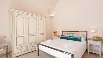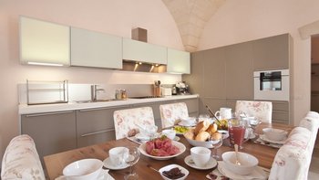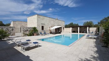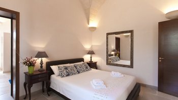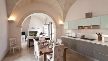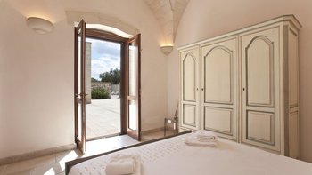 Mit modernem Dekor, hellen Steinwänden, Marmorböden und herrlichen Gewölbedecken liegt dieses wunderschöne Haus in ruhiger Abgeschiedenheit Privat nach, ländlichen Hektar und strahlt einen Hauch kühle, ruhige Entspannung aus. Ein geschlossener Innenhof an der Vorderseite der Villa hat ein fast maurisches Flair, mit sanfter Beleuchtung für laue Abende, die die anmutige Architektur der Masseria hervorheben. Ein größerer Innenhof im hinteren Bereich beherbergt einen ungewöhnlich großen Swimmingpool mit Sonnenschirm für einen Sitzbereich am Pool und eine Pergola für Mahlzeiten im Freien. Französische Türen führen von hier aus in den Wohnbereich, wo ein luftiges, cremeweißes Wohnzimmer zur Essküche hin offen ist, deren schlankes Design durch ländliche Stoffe aufgeweicht wird. Und in einer Aufteilung, die zwei Familien mehr Privatsphäre bieten würde, sind die Zimmer vom Kreuzgang aus zugänglich, zwei im Mittelteil, zwei im Seitenflügel, und alle klimatisiert, elegant und übersichtlich.