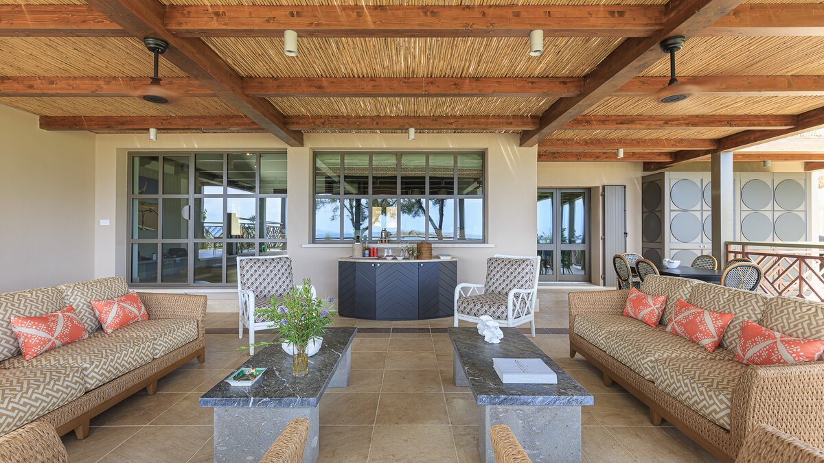 Im Inneren zelebrieren die lichtdurchfluteten Wohnräume die umliegende Landschaft mit großen Fenstern, die die Grüne und die Meereslandschaft umrahmen. Dessen moderne Küche und der Essbereich sind mit einer frischen, lebendigen Ästhetik gestaltet und machen Unterhaltung zu einem Vergnügen. Vier wunderschön eingerichtete Doppelschlafzimmer sind auf zwei Etagen angeordnet, jedes mit Zugang zur Terrasse, eigenem Bad und Meerblick. Im Obergeschoss befinden sich zwei Schlafzimmer mit separaten Sitzbereichen, während drei Zimmer mit optionalen Schlafsofas ausgestattet sind, die sich ideal für Familien oder größere Gruppen eignen.