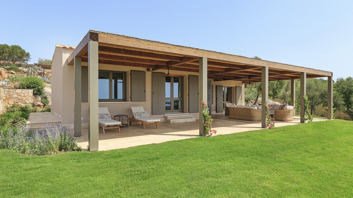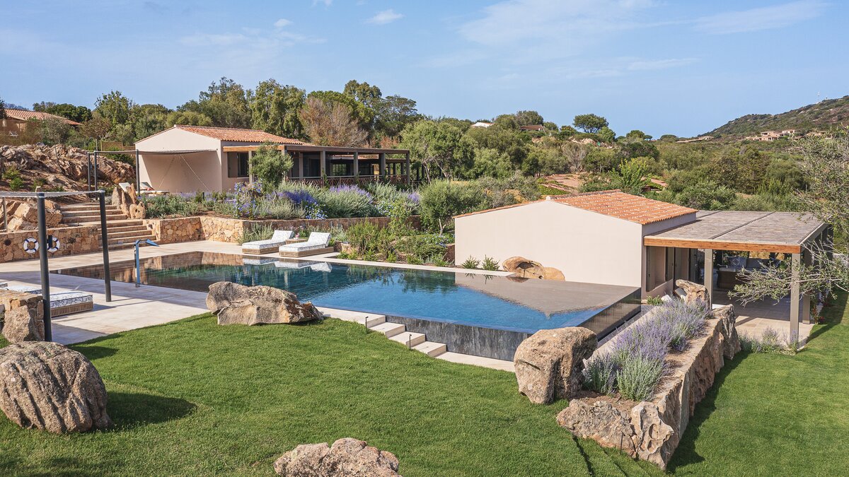 Im Außenbereich erstreckt sich ein schillernder Infinity-Pool über die Terrasse, umrahmt von üppigen Gärten und Panoramablick auf das Meer. Eine weitläufige Sonnenterrasse lädt zum Entspannen unter der Sonne Sardiniens ein, während ein mit Pergola überdachter Essbereich den perfekten Rahmen für Mahlzeiten im Freien bietet. Ein kurzer Spaziergang führt zu einem privaten Strandbereich, wo goldener Sand und ruhiges Wasser friedliche Momente am Meer bieten.