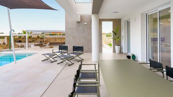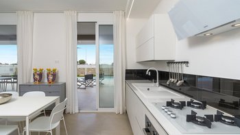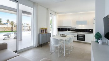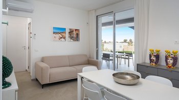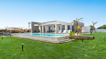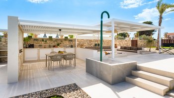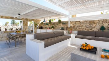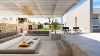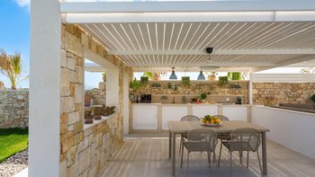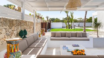Im Inneren verbindet die Villa Pomelia moderne Eleganz mit Zweckmäßigkeit. Dessen offenes Erdgeschoss ist hell und einladend und vereint einen Sitzbereich, einen Essbereich und eine voll ausgestattete Küche, die für ein geselliges Wohnen konzipiert ist. Jedes Schlafzimmer ist für Komfort klimatisiert und verfügt über große Fenster, die die Innenräume mit den üppigen Gärten im Freien verbinden. Dessen Design der Villa fördert ein nahtloses Innen- und Außenleben mit viel Platz, um sich zu treffen oder sich in ruhigere Ecken zurückzuziehen. Denen Gäste können ihre Mahlzeiten drinnen genießen oder draußen in die überdachte Außenküche und den Essbereich im Freien gehen, wo lange Mittag- oder Abendessen in der warmen sizilianischen Luft genossen werden können.