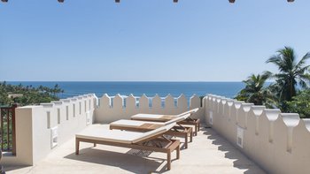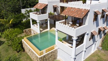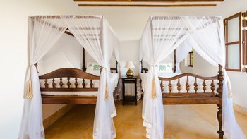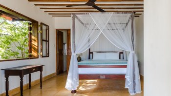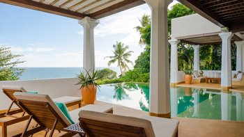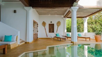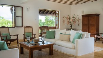 Im Inneren bietet die Villa ein schickes, luftiges Interieur, das sri-lankische Antiquitäten nahtlos mit indischen Stoffen und lokalen handgewebten Juteteppichen verbindet. Dessen Design, inspiriert von der traditionellen Suaheli-Architektur, schafft eine harmonische Atmosphäre im gesamten Gebäude. Jedes der fünf Schlafzimmer mit eigenem Bad ist großzügig und geschmackvoll eingerichtet, komplett mit einer eigenen Veranda mit einem außergewöhnlichen Blick auf das Meer. Dessen formelles Wohnzimmer strahlt entspannte Eleganz aus und bietet die perfekte Kulisse für entspannte Geselligkeit. Für weitere Entspannung sorgt ein Massageraum am Pool mit Kerzen, Weihrauch und den Dienstleistungen des besten Masseurs der Insel.