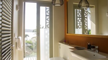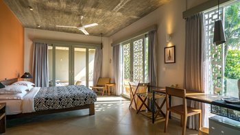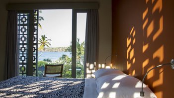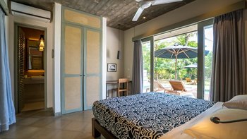 Im Erdgeschoss befindet sich ein Schlafzimmer mit eigenem Bad und Blick auf das Meer, das sich zur Poolterrasse öffnet. Im ersten Stock befinden sich vier Schlafzimmer, jedes mit eigenem Balkon und ungestörtem Meerblick; die Master- und Junior-Suiten haben beide eine Badewanne auf ihren Balkonen. Dies ist das perfekte Haus für Yoga-Liebhaber, da es ein wunderschönes Open-Air-Yoga- und Ayurveda-Studio gibt, das sich am Ende der Halle im ersten Stock mit Blick auf das Meer befindet. Wenn Sie weiter nach oben gehenund erreichen Sie den Dachgarten der Villa mit einem Gemüse- und Gewürzgarten und einer Bar, an der Sie bei Sonnenuntergang Cocktails trinken können – der Villa Manager ist Mixologe! Die letzten beiden Schlafzimmer liegen hinter dem Pool im Garten, jedes mit eigener Gartendusche, ideal für Teenager oder junge Erwachsene.