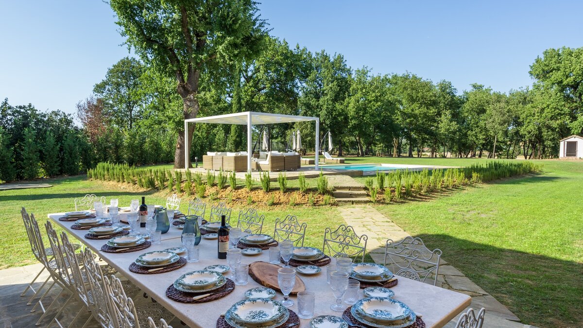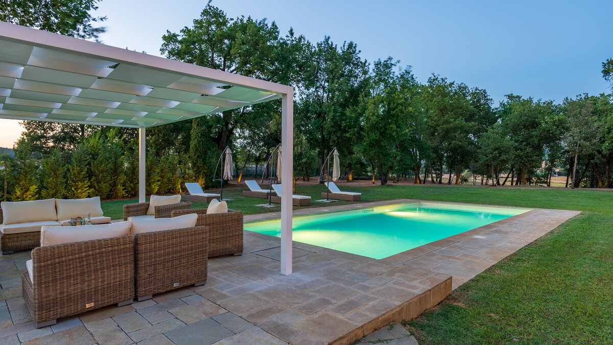 Wenn Sie nach draußen gehen, erwacht die Podere Lucilla zum Leben. Deren weitläufige Anlage bietet zahlreiche Plätze für Mahlzeiten im Freien, von schattigen Terrassen bis hin zur Außenküche mit Pizzaofen und Grill. Liegestühle umgeben den einladenden Pool, ideal für entspannte Nachmittage in der toskanischen Sonne. Denen charmanten mittelalterlichen Stadt Lucignano ist nur eine kurze Autofahrt entfernt und bietet mit ihren engen Kopfsteinpflasterstraßen, der historischen Architektur und den lokalen Trattorien einen Einblick in das authentische italienische Leben. Weiters entfernt liegen viele weitere malerische Städte und die kulturellen Reichtümer von Siena und Florenz sind leicht zu erreichen, was die Podere Lucilla zu einem idealen Ausgangspunkt macht, um alles zu entdecken, was die Toskana zu bieten hat.