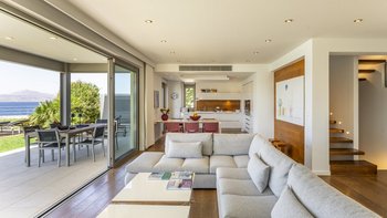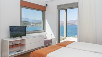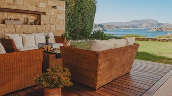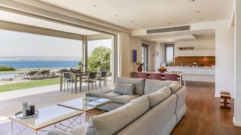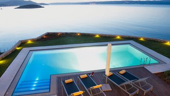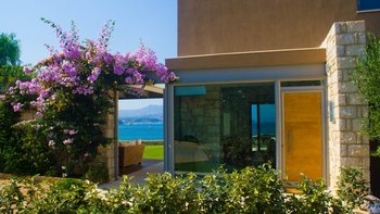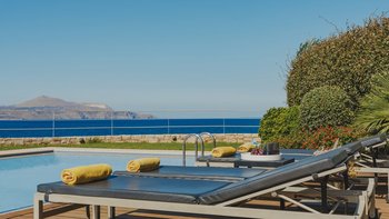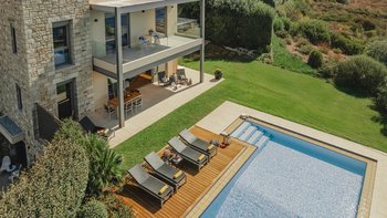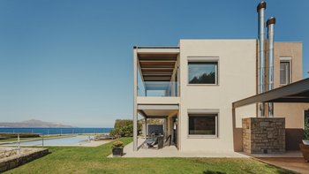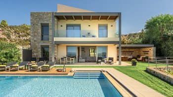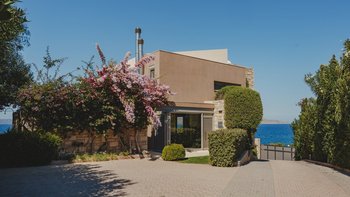 Mit herrlichem Blick auf die Bucht von der außergewöhnlichen Poolterrasse und von fast jedem Zimmer im Haus, liegt diese Luxusvilla auf Kreta über dem Wasser, nur einen kurzen Spaziergang vom Strand entfernt.