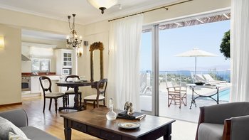 • Alle Gäste der Pleiades Villas haben freien Zugang zu allen öffentlichen Bereichen, dem Strand und der Kinderkrippe / dem Kinderclub / dem Teenagerclub des preisgekrönten Schwesterhotels Domes of Elounda, Autograph Collection (15 Minuten Fahrt von den Pleiades Villas entfernt)