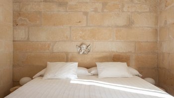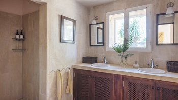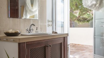 Eine beeindruckende Steintreppe führt in den ersten Stock, wo sich das Hauptschlafzimmer befindet. Der Hauptschlafzimmer bietet Meerblick und ein sehr geräumiges Bad mit eingelassener Badewanne und separater Dusche. Ebenfalls auf der ersten Etage befinden sich zwei weitere Schlafzimmer; ein Doppelschlafzimmer mit Zugang zu einer möblierten Terrasse, ideal zum Lesen oder Sonnenbaden und ein Duschbad en suite, und ein Zweibettschlafzimmer en suite. Für größere Gruppen oder diejenigen, die mehr Privatsphäre benötigen, gibt es ein Gästehaus mit einem Doppelschlafzimmer mit Dusche en suite und einem weiteren Zweibettschlafzimmer mit Dusche, die jeweils von außen zugänglich sind. Draußen gibt es einen beneidenswert großen Privater Pool mit Panoramablick auf die Küste und hübsche Gärten