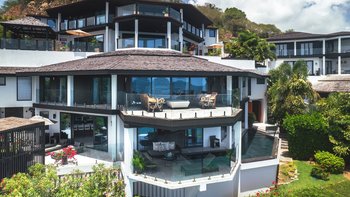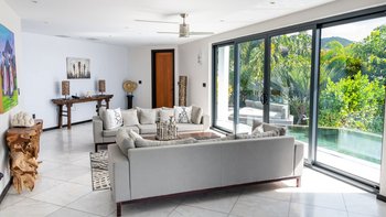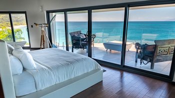 Im Inneren werden die Gäste von einem geräumigen und stilvollen Wohnbereich begrüßt. Glaswände umrahmen den Panoramablick auf das Meer und führen in das große Wohnzimmer, den Essbereich, die Bar und die OFFENER GRUNDRISS Küche. Ein spezieller Medienraum bietet einen perfekten Ort für Unterhaltung. Deren Villa verfügt über drei Schlafzimmer mit eigenem Bad, jedes mit Kingsize-Betten, die sich auf der ersten Etage befinden. Deren Master-Suite zeichnet sich durch ihre große, private Lounge-Terrasse aus, die einen atemberaubenden Blick und Sonnenuntergänge bietet.