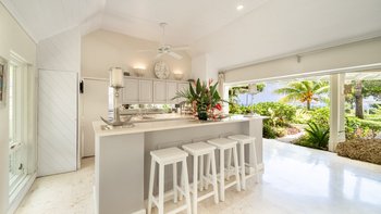 Im Inneren erwartet Sie ein geräumiges Wohnzimmer, das sich zu einem stilvollen Barbereich öffnet. Dessen Interieur der Villa verbindet Eleganz mit Komfort und verfügt über zwei separate Essbereiche: einen für formelle Anlässe und einen anderen für entspannte Mahlzeiten. Eine gut ausgestattete Küche ermöglicht kulinarische Erkundungen oder den Genuss von lokalen „Bajan“-Gerichten, die vom hauseigenen Koch zubereitet werden. Deren Villa bietet Platz für bis zu zehn Gäste in fünf klimatisierten Schlafzimmern, jedes mit eigenem Bad. Drei Schlafzimmer befinden sich im Haupthaus, während zwei in separaten Cottages untergebracht sind und eine ideale Mischung aus Gemeinschaftsleben und Privatsphäre bieten. Für zusätzliche Entspannung verfügt die Villa über einen klimatisierten TV-Raum mit bequemen Tagesliegen. Das durchdachte Design des Point of View erstreckt sich auch auf die Außenbereiche mit zwei Swimmingpools, einem Pavillon und weitläufigen Sonnenterrassen, die alle in einem 2 Hektar großen, üppigen tropischen Garten liegen. So können die Gäste während ihres Aufenthalts sowohl gemeinsame Erlebnisse und auch Momente der Einsamkeit genießen.