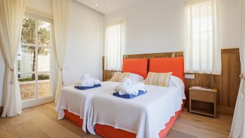 • Schlafzimmer mit Doppelbett (kann zwei Einzelbetten sein) mit Dusche en suite mit Zugang zur Gartenterrasse mit Meerblick