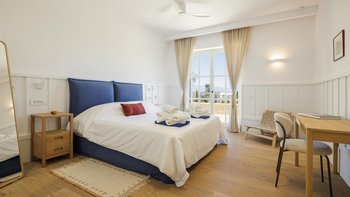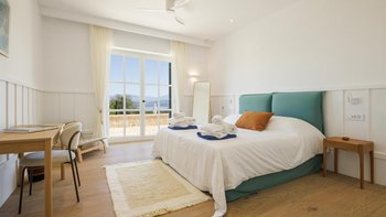 • Schlafzimmer mit Doppelbett (kann zwei Einzelbetten sein) mit Dusche en suite und Zugang zum Balkon mit Meerblick