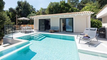 Villa Sterna ist ein wunderschönes Neubauobjekt auf Korfu mit herrlichem Blick über das Meer und Richtung Albanien. Ins Innere ist das Haus kühl und luftig, mit minimalistischen Möbeln und frischen, weiß getünchten Wänden. Im Haupthaus befinden sich eine geräumige offene Küche, ein Wohn- und Essbereich sowie ein Schlafzimmer mit Doppelbett und ein Schlafzimmer mit eigenem Bad. Deren Villa verfügt auch über ein eigenständiges Schlafzimmer mit Doppelbett, das von außen über einen eigenen Eingang zugänglich ist. Dieses Zimmer verfügt auch über ein eigenes Bad.
