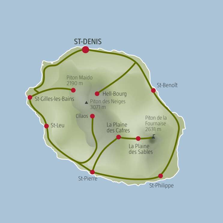Der 2631 m hohe Piton de la Fournaise zählt zu den aktivsten Vulkanen und ist in den letzten 50 Jahren über 150 Mal ausgebrochen. Eine Wanderung durch die bizarre und karge Mondlandschaft rund um den Krater gehört sicherlich zu den Höhepunkten einer Réunion-Reise (warme Kleidung ist empfehlenswert).