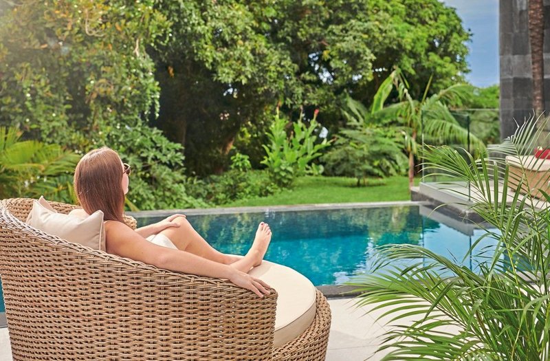 In der großzügigen Bungalow-Anlage in modernem Design entspannen Sie nicht nur am Pool sondern auch im Wellnessbereich.
