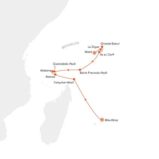 Es erwartet Sie ein facettenreiches Inselparadies im Indischen Ozean! Puderweisse Strände schmiegen sich an türkisblaues Wasser. Geschliffene Granitfelsen und Kokospalmen sind der absolute Hingucker in dieser paradiesischen Postkartenidylle. Die Inneren und Äusseren Inseln der Seychellen begeistern nicht nur optisch. Die entlegenen naturgeschützten Aldabra-Inseln lassen sich nur mit kleinen Schiffen bereisbar; sie beherbergen eine endemische Tierwelt und schillernde Unterwasserwelt. Expedition pur: Sie werden kompetent begleitet von deutschsprachigen Experten und sind wendig unterwegs im Zodiac-Schlauchboot.