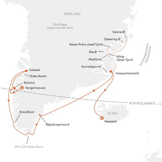 Das Beste von Grönland! Diese einmalige Kontrastroute verbindet Grönlands West-, Süd- und Ostküste. Es ist der Lebensraum von Moschusochsen, Polarfüchsen, Eisbären und Walen. Nicht nur die Tierwelt und die fantastischen Landschaften berauschen das Auge, auch die himmlischen Polarlichter sind bei klarem Wetter von Deck aus zu sichten. Sie reisen von kleinen Siedlungen hin bis zu den Extremen der Arktis mit dem weltgrössten Nationalpark.