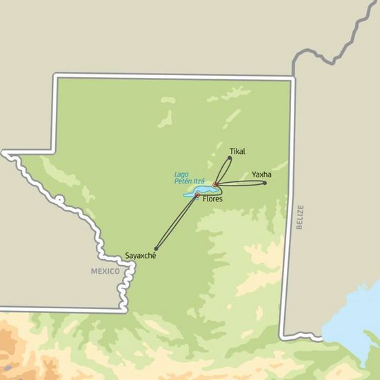 Besuch der Mayastätte Yaxha, welche auf einem Höhenzug über dem Ufer der gleichnamigen Lagune liegt. Yaxha ist einer der grössten Maya-Orte, welcher im Tieflanddschungel des Peten entdeckt wurde. Von der Spitze der Struktur 216 geniessen Sie einen eindrucksvollen Ausblick über das Dschungeldach. Danach Bootsfahrt zur Halbinsel Topoxte und Besuch der restaurierten Anlage. Diese wird von Historikern zu den Post-Klassik-Stätten gezählt, eine Zeit, als Tikal und andere Stätten bereits verlassen waren.