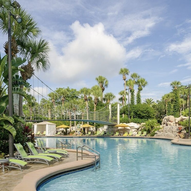 Die Parkanlage ist riesig und üppig grün. Dazu passt die Poolanlage – Kinder lieben sie und wollen gar nicht mehr raus! Wobei die tolle Lage zu Disney und Co. ein gutes Argument sein sollte, das Hotelgelände zu verlassen. Sie kommen ja wieder!