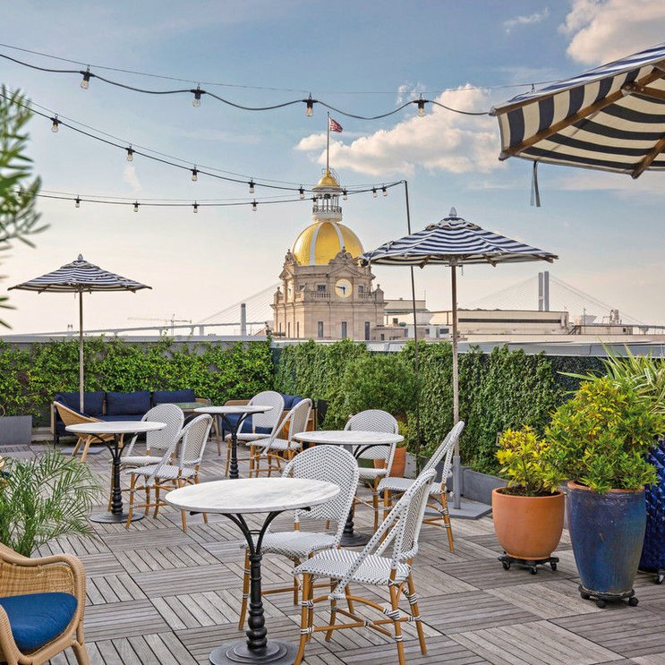 Rooftop Bar mit Aussicht: Die stilvolle Dachterrasse bietet spektakuläre Blicke über den Savannah River und die historische Altstadt – ein perfekter Ort für den Sundowner