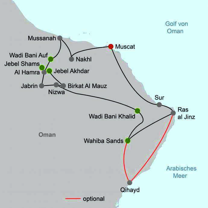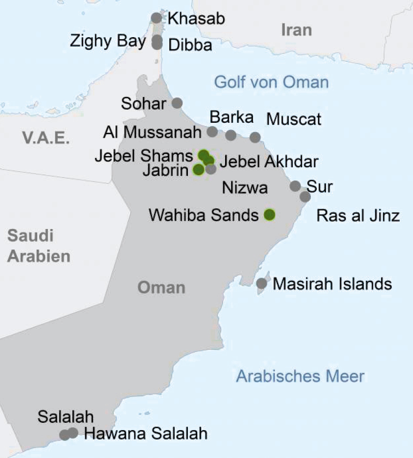 Die Wahiba Sands sind für ihre goldenen Dünen bekannt, ideal für Wüstencamps und Kameltouren. Das Rub al-Khali, die grösste Sandwüste der Welt, beeindruckt mit endloser Weite. In den Bergen bietet der Jebel Shams, der „Grand Canyon des Oman“, spektakuläre Ausblicke, während der Jebel Akhdar mit fruchtbaren Terrassen und kühlerem Klima überrascht.