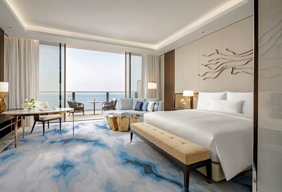 - 51-60 qm, Blick auf den arabischen Golf, Ankleidebereich, Doppelbett (Kingsize), Badewanne, WC, Bademantel, Badeslipper, Klimaanlage, Minibar kostenpflichtig, Safe, TV (Smart-TV), WLAN, Espressomaschine, Balkon