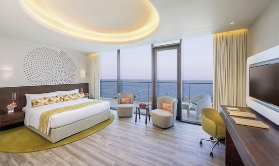 - 71-80 qm, Suite, 1 Schlafzimmer, Meerblick, separater Wohnraum, Badewanne, Regendusche, WC, Bademantel, Badeslipper, Haartrockner, Klimaanlage, Minibar kostenpflichtig, Safe, Bügelbrett, Bügeleisen, TV, WLAN, Wasserkocher, Kaffee/Tee, Balkon, Zutritt zur Club-Lounge, nachmittags Hors d'oeuvres, nachmittags Kaffee/Tee und Gebäck, Snacks am Abend, bodentiefe Fenster