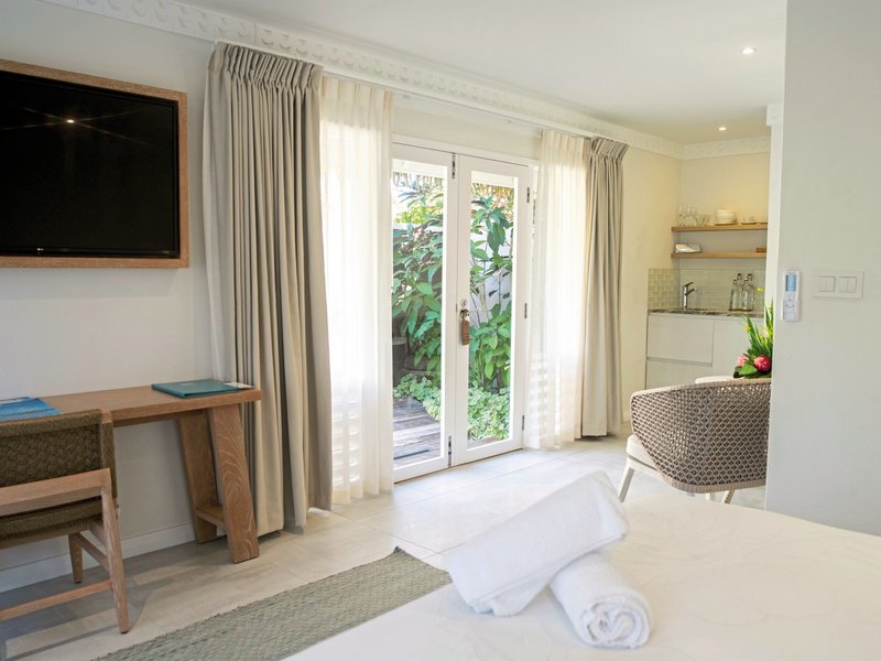 - 51-60 qm, Bungalow, Gartenseite, Doppelbett (Kingsize), Dusche, Außendusche, WC, Haartrockner, Klimaanlage, Mini-Kühlschrank, Safe, Bügeleisen, TV, Musikanlage, WLAN, Kochnische, Mikrowelle, Kaffee/Tee, Terrasse, Garten