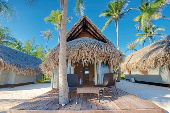 - 31-35 qm, Bungalow, (freistehend), Meerseite, Lagunenblick, Schreibtisch, Doppelbett (Kingsize), Sofabett, Dusche, separates WC, Haartrockner, Holzboden, Klimaanlage, Ventilator, Minibar kostenpflichtig, Safe, TV, WLAN, Wasserkocher, Kaffee/Tee, Terrasse, bei Ankunft im Zimmer Wasser (1 Flasche)